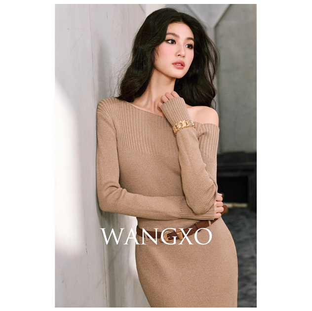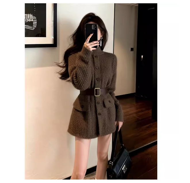 小个子气质收腰小香风立领咖色针织连衣裙女冬
